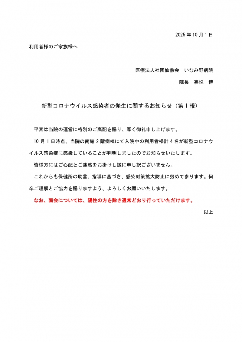 新型コロナウイルス感染者の発生に関するお知らせ ご家族の皆様へ